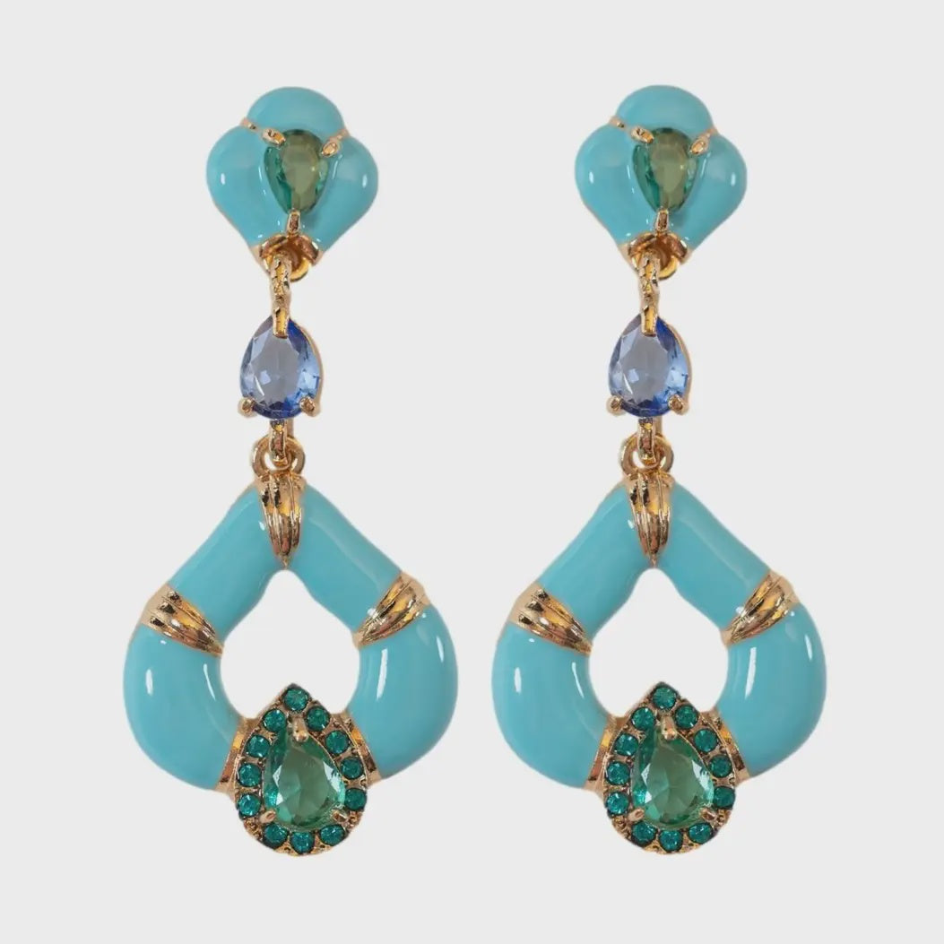 Inspired by our travels through Greece and Turkey, these statement earrings feature a bold turquoise enamel teardrop design accented with vibrant green and blue gemstones. The 2” size and flattering turquoise hue make them the perfect accessory for adding an elegant yet bold punch to any outfit.