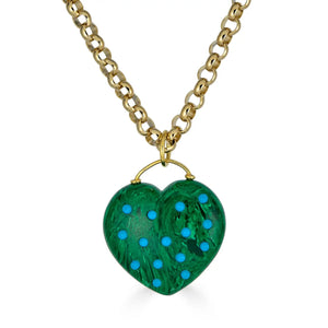 A rich green malachite heart pendant adorned with scattered turquoise accents, hanging from a classic rolo chain. A striking mix of natural color and timeless style. * Necklace measures 16"+2" adjustable closure * Pendant measures approximately 1 1/2" * Malachite * Turquoise * 14k gold plated brass * Handmade in the USA