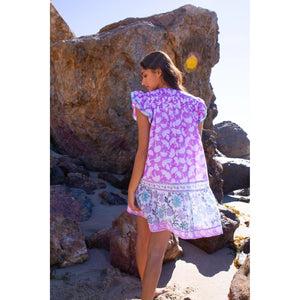 Silk cotton voile hand blocked mini dress with split neckline, ruffle cap sleeves, and tassel ties at the neck.