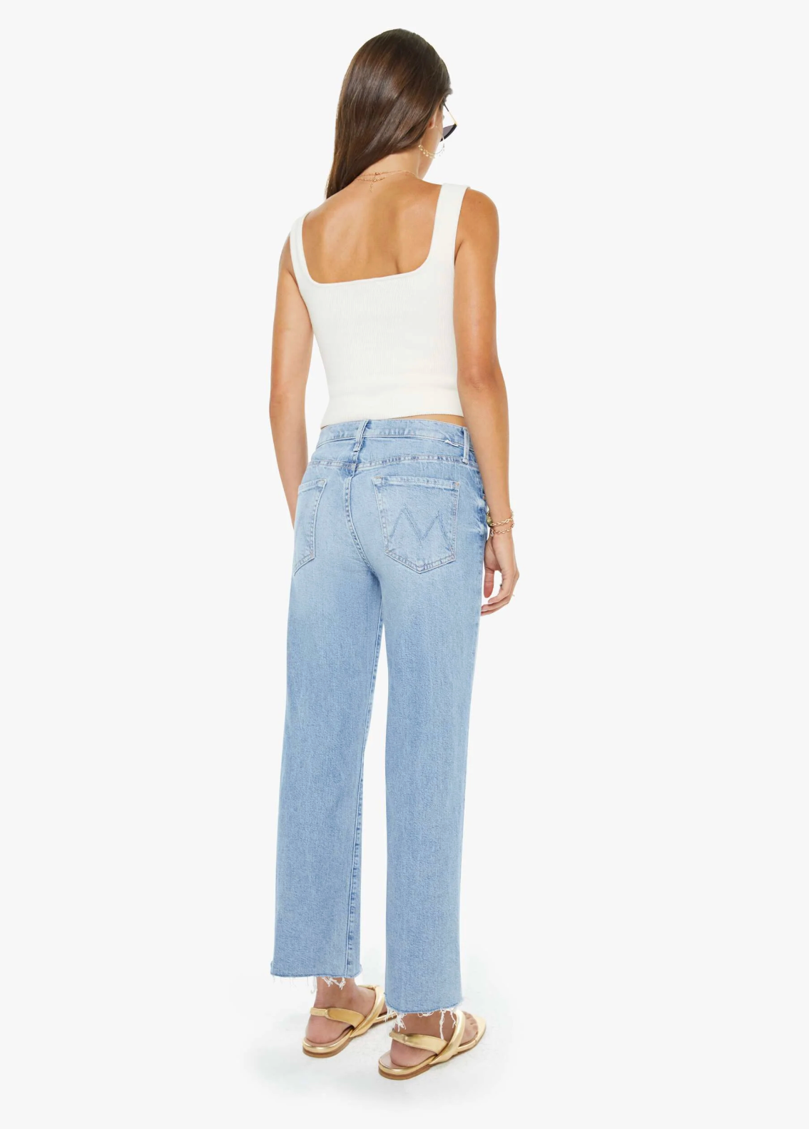 Back in action. Mid-rise jeans with a wide straight leg, zip fly and an ankle-length inseam with a frayed hem. Made from semi-rigid denim, Comeback Kid is light blue with subtle whiskering and fading at the knee.