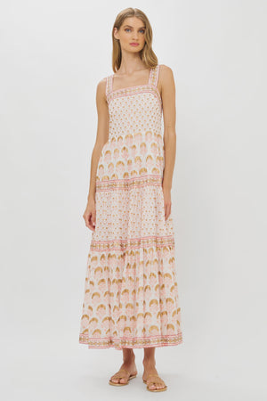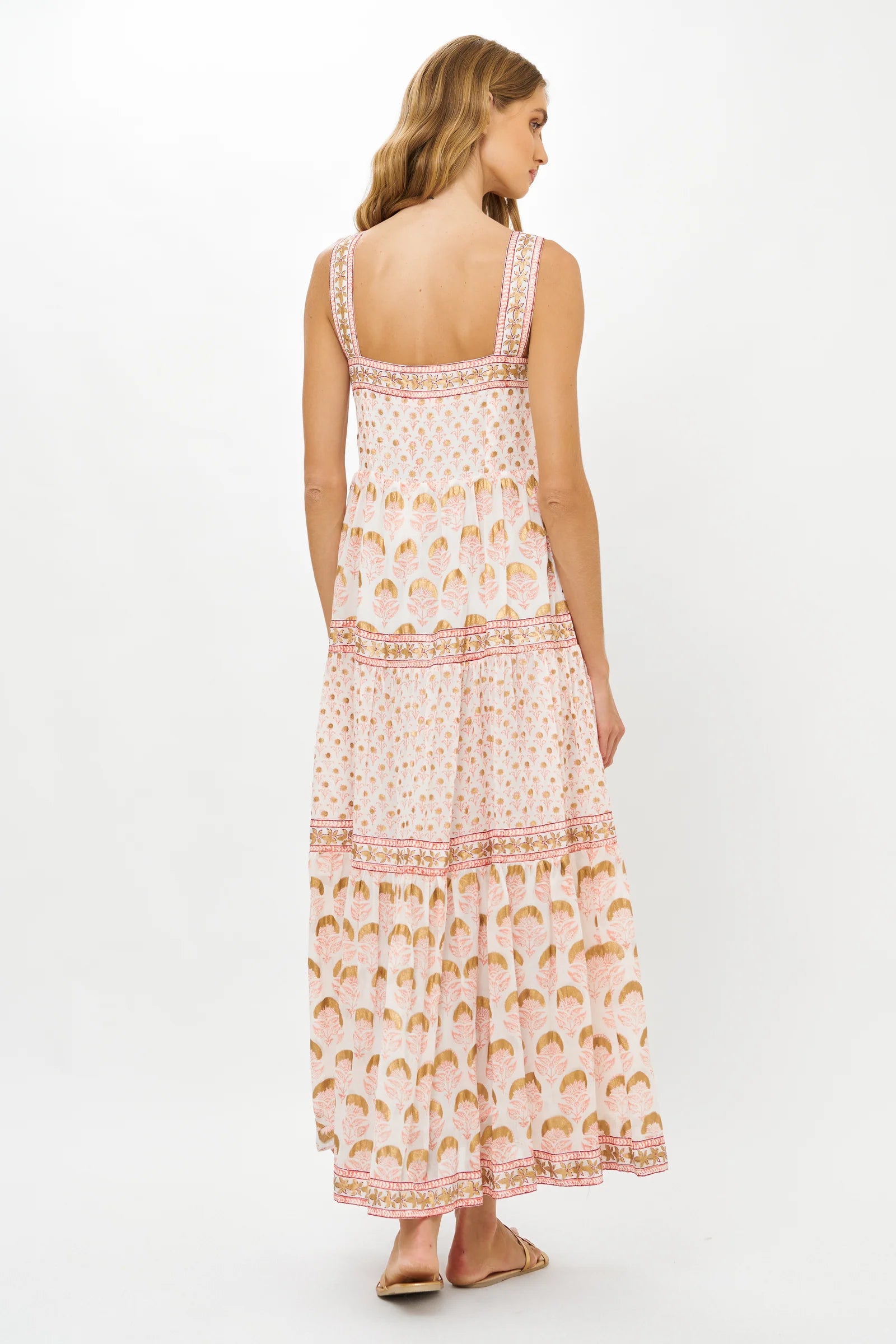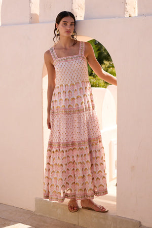 Envisioned for sun-drenched afternoons and the rhythmic ease of coastal living, this silhouette is a study in airy sophistication. It captures the effortless spirit of a seaside getaway, designed for the woman who finds luxury in the movement of a tiered skirt and the delicate shimmer of artisanal gold.