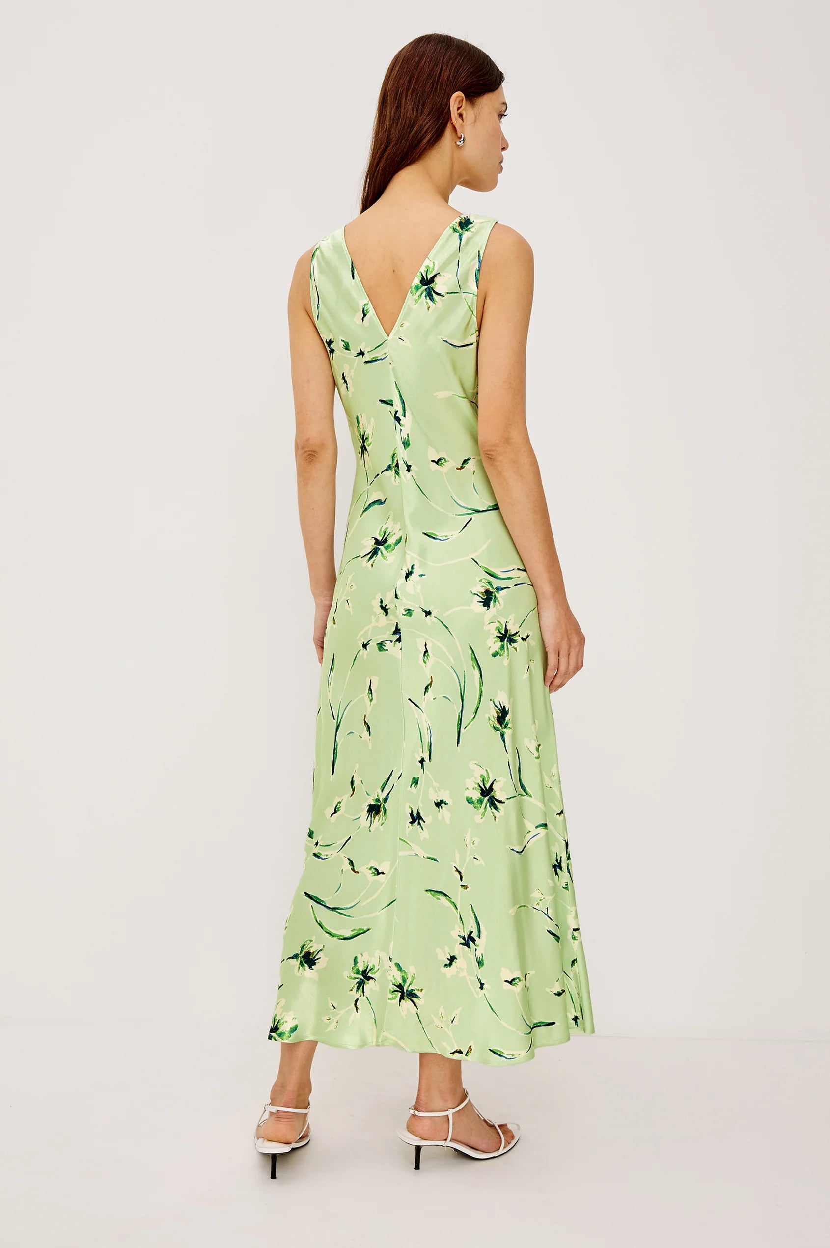 The Camellia is a lustrous satin crepe maxi dress cut on the bias for elegant drape and movement, finished with wide shoulder straps and a flattering V-neckline.