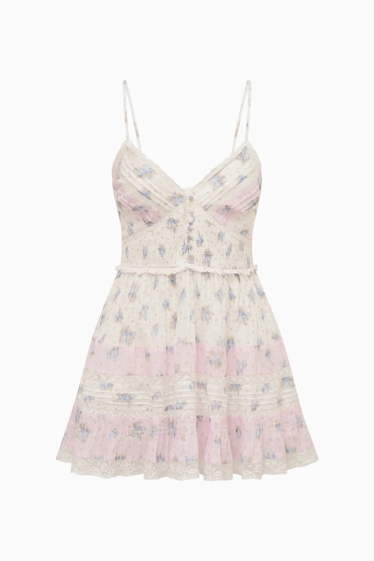 The Krista Dress is made for sunny escapes and warm weather. Designed from a lightweight tissue voile with an ikat-inspired floral, this effortless mini features a smocked waist, delicate spaghetti straps, and a V-neckline framed with pintucks, lace trims, and tiny buttons for a touch of Victorian charm. Finished with a flirty, pull-on skirt—your perfect warm-weather getaway piece.
