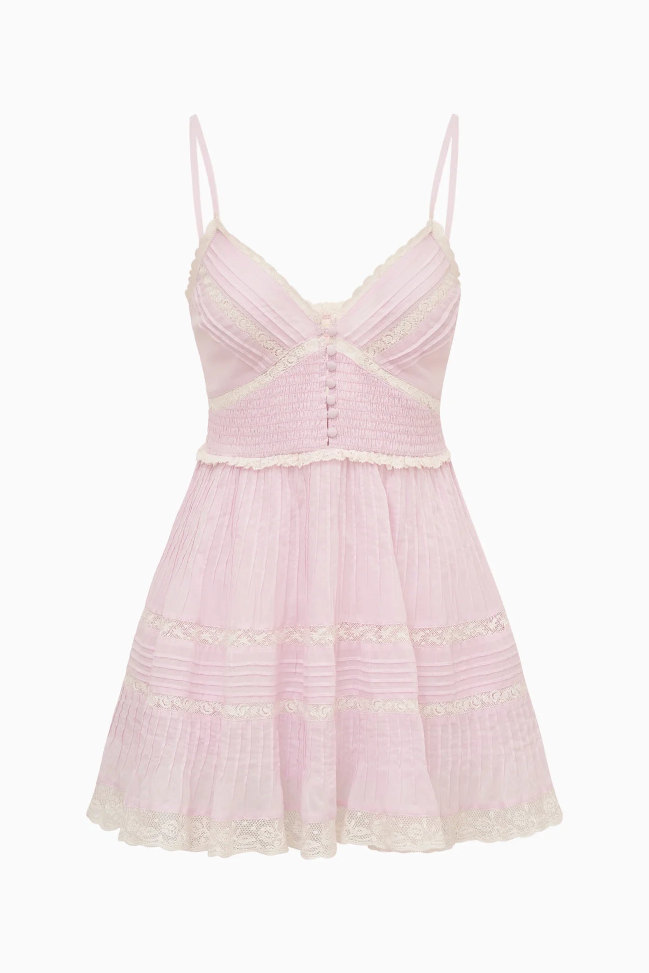 The Krista Dress is made for sunny escapes and warm weather. Designed from a lightweight tissue voile with an ikat-inspired floral, this effortless mini features a smocked waist, delicate spaghetti straps, and a V-neckline framed with pintucks, lace trims, and tiny buttons for a touch of Victorian charm. Finished with a flirty, pull-on skirt—your perfect warm-weather getaway piece.