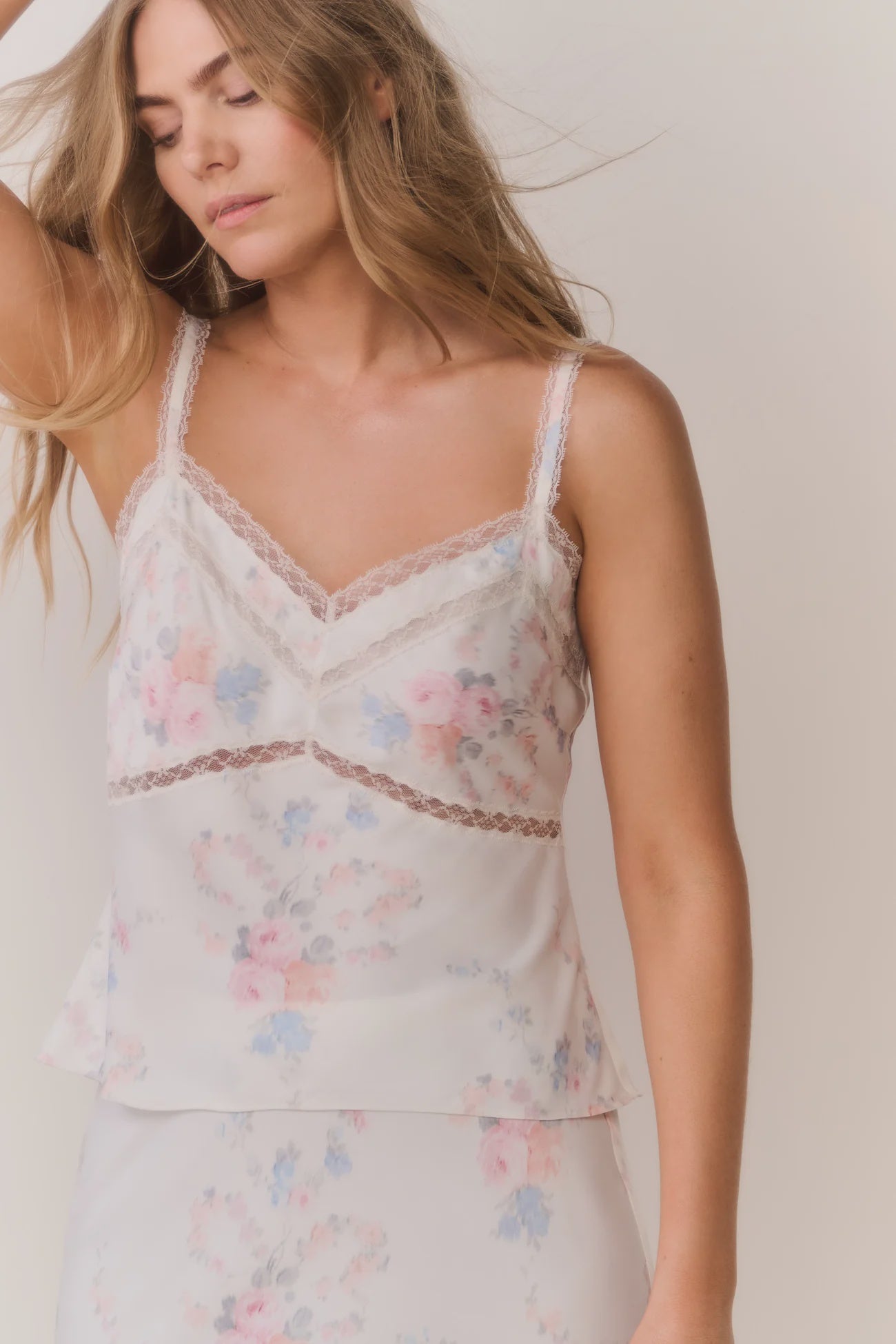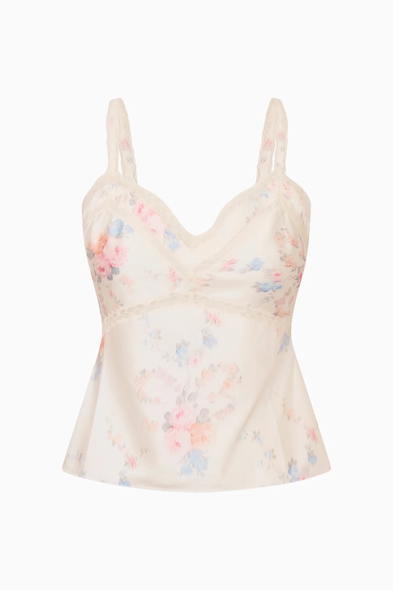The Lirena Cami Top is crafted from lightweight satin fabric in a whimsical floral pattern. This V-neck top is adorned with delicate lace insets and slender spaghetti straps, making it a versatile staple for layering or wearing on its own.