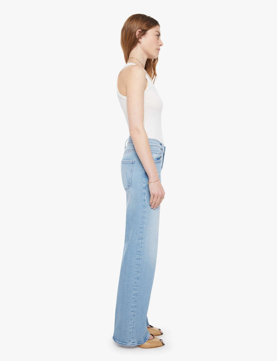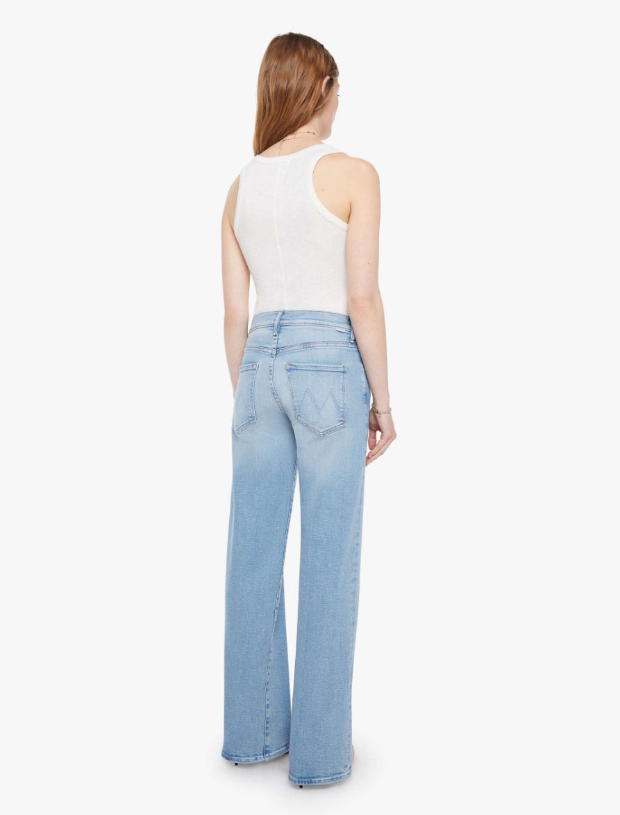 Change is in the air. Mid-rise jeans with a loose fit, zip fly, wide leg and 34-inch inseam with a clean hem. Made from stretch denim, Blowing In The Wind is a light-blue with whiskering and fading at the knees.