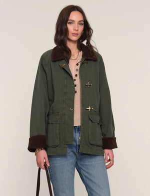 The Charla Jacket is our spin on a chore coat. Made from a washed cotton twill, it features corduroy collar and cuffs, oversized patch pockets, and brass hook & eyes. We love it thrown over all our fall outfits.
