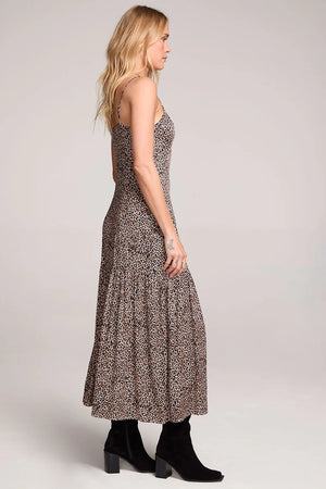 The Marcela Leopard Midi Dress features a classic silhouette with spaghetti straps and a subtle V neckline.