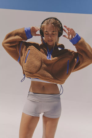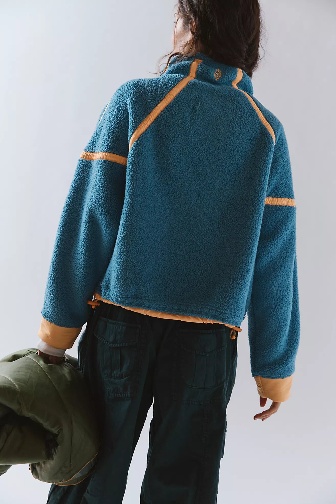 Cozy fleece pullover featuring a half-zip closure and high neckline with bold contrast seams throughout and an adjustable hemline.