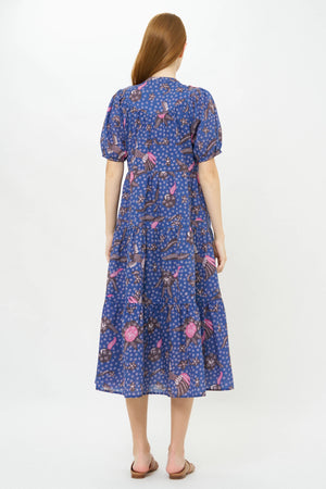 A delicate micro print is layered with feathery florals, graceful songbirds and mother of pearl buttons to enhance the thoughtful design details of this dress.
