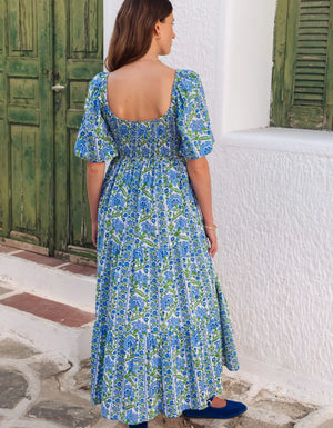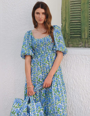 The much-loved Angelina dress is a go-to for weddings, parties and more. Featuring a comfortable, smocked body, flattering scoop neck and easy, puff sleeves, the Angelina dress is effortlessly chic. Block-printed by hand in our rich Sapphire Border, we love the rich shades of blue and green in this standout piece. A useful favorite you’ll reach for again and again.