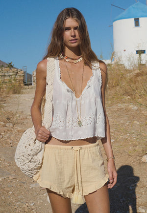 The Maiden Lace Cami in Antique White is pure romantic rebellion. Crafted from custom Anglaise in 100% organic cotton voile, this piece whispers vintage charm with a playful modern spirit. Delicate pintucks frame the front and back neck, while a keyhole opening and adjustable tie let you own the fit. Finished with a scallop trim edge that catches the light—the perfect silhouette for those who dress with intention and joy.